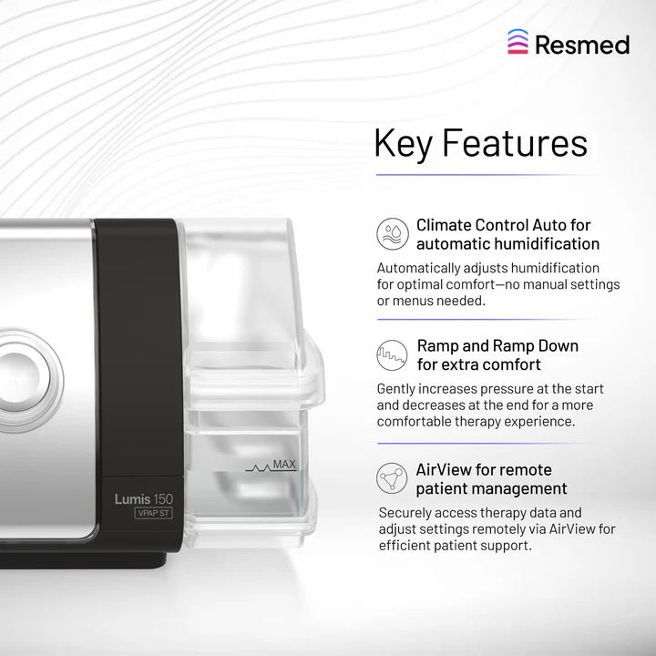 Order your ResMed BiPAP Lumis 150 VPAP ST-A today and experience next-generation respiratory support designed for comfort and peace of mind.